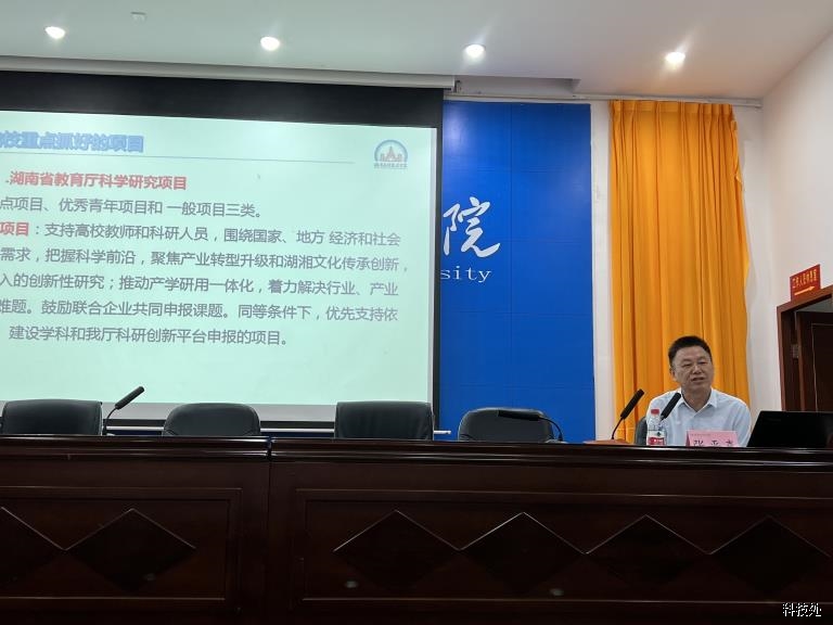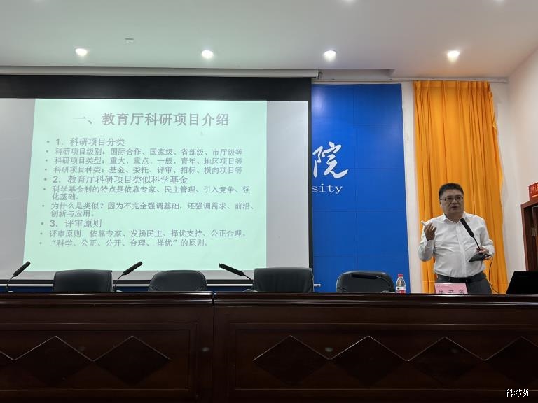 最后,张平喜处长以“立足科技项目,突破科研成果”为主题对本次开展申报的省级、校级科研项目的具体要求进行了详细介绍,鼓励青年教师积极开展科研,并提出了项目建设工作的“3个强化”,要强化项目申报工作、强化项目执行和落实、强化绩效评价及结果运用。