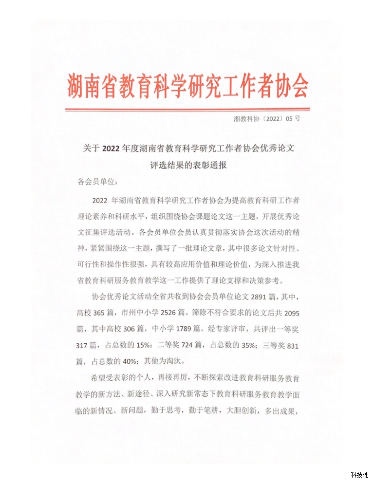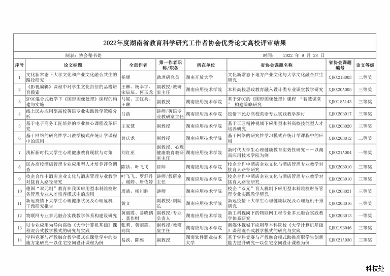 2022年度湖南省教育科学研究工作者协会优秀论文表彰通报 湖南应用技术学院-科技处 2022/10/20 10:38:22 672 上一篇:关于认真做好2022年度湖南省哲学社会科学基金项目申报工作的通知 下一篇:关于申报2023年度省市重点建设项目和重大前期项目的通知