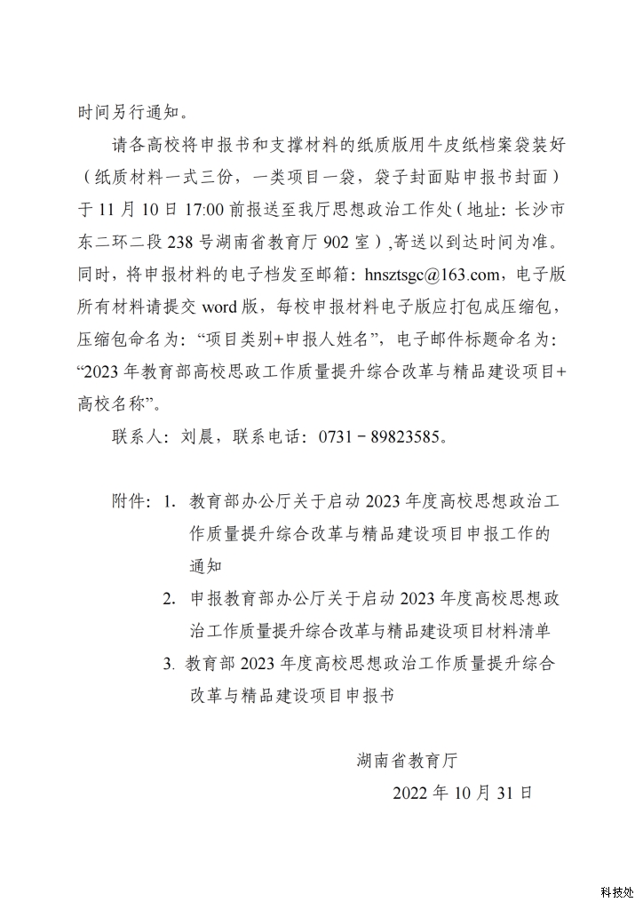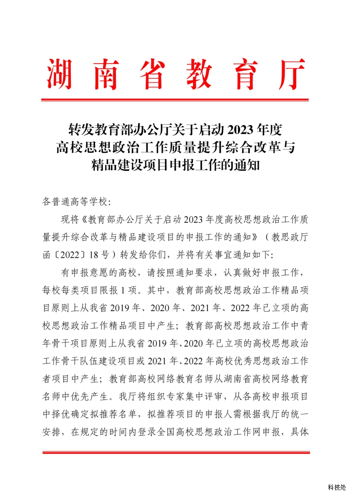 转发教育部办公厅关于启动2023年度高校思想政治工作质量提升综合改革与精品建设项目申报工作的通知 湖南应用技术学院-科技处 2022/11/1 10:52:34 584 上一篇:关于做好湖南省教育科学“十四五”规划 2023年课题申报工作的通知 下一篇:湖南省社科联关于开展“贯彻二十大 奋进 新征程”党内法规制度建设主题征文活动的通知