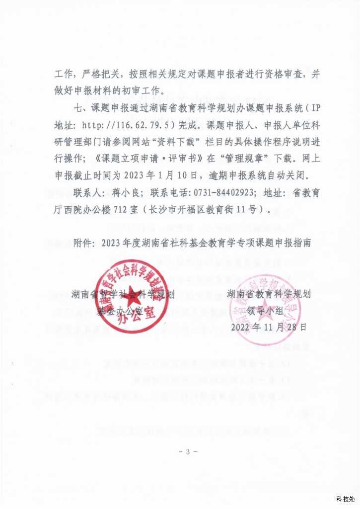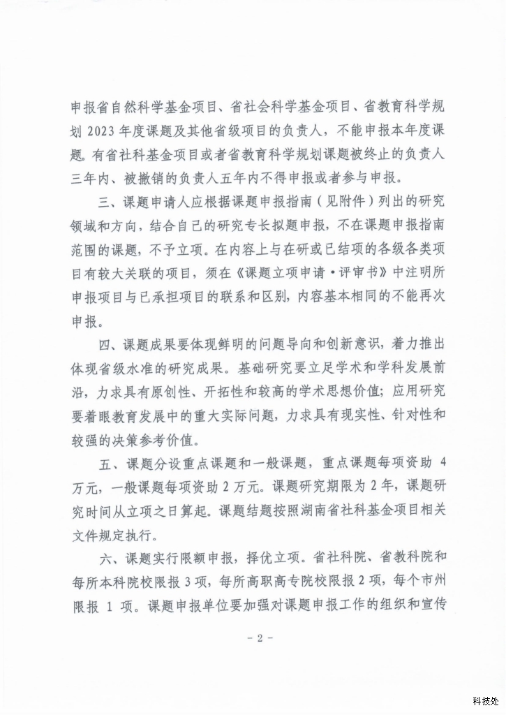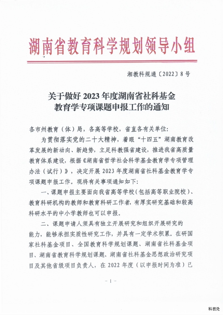 关于做好2023年度湖南省社科基金教育学专项课题申报工作的通知 湖南应用技术学院-科技处 2022/11/28 11:19:37 636 上一篇:2023年湖南省知识产权战略推进专项项目申报指南 下一篇:关于公布2022年湖南省教育厅科学研究项目立项结果的通知
