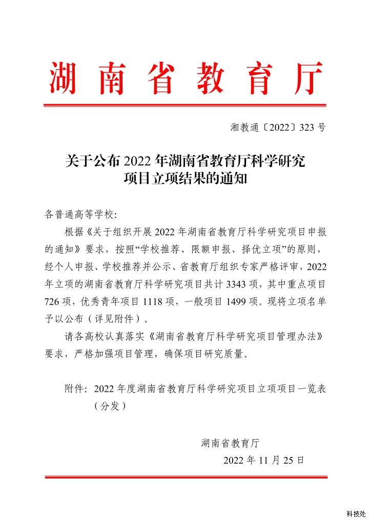 关于公布2022年湖南省教育厅科学研究项目立项结果的通知 湖南应用技术学院-科技处 2022/12/1 11:22:54 608 附件:湖南应用技术学院2022年湖南省教育厅科学研究项目立项结果 上一篇:关于做好2023年度湖南省社科基金教育学专项课题申报工作的通知 下一篇:关于第九届高等学校科学研究优秀成果奖(人文社会科学)申报工作的通知