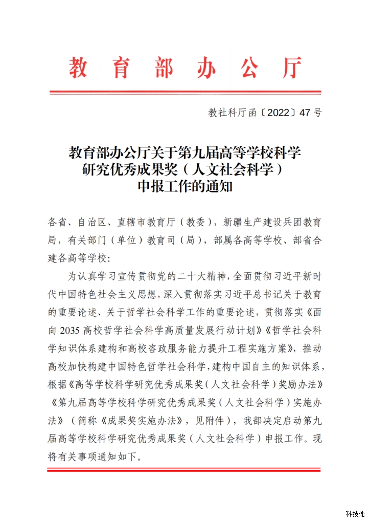 关于第九届高等学校科学研究优秀成果奖(人文社会科学)申报工作的通知 湖南应用技术学院-科技处 2022/12/5 11:28:57 646 附件:关于第九届高等学校科学研究优秀成果奖(人文社会科学)申报工作的通知 上一篇:关于公布2022年湖南省教育厅科学研究项目立项结果的通知 下一篇:关于立项建设湖南省“十四五”重点学科和应用特色学科的通知