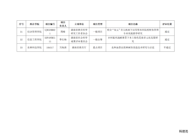 根据湘教发〔2021〕27号《湖南省教育厅科学研究项目管理办法(2021年第三次修订)》等文件精神,学校组织了2022年下半年科学研究项目校内结题评审工作。经专家评审,拟确定“地域文化视野下张家界永定区旅游品牌形象设 计研究”等32个项目通过校内结题验收,项目“良种油茶自然林树形改造技术研究与示范”不通过结题验收,具体项目见下表。