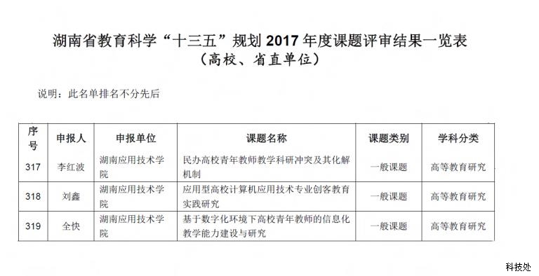 经过省规划办组织专家评审,我院申报的3项2017年度湖南省教育科学“十三五”规划课题顺利立项,在今后的两年内,各课题组成员将分别针对信息化教学能力建设、高校教育科研联动机制改革、学生创客教育等方面开展课题研究,此次获准立项的课题具体名单如下:
