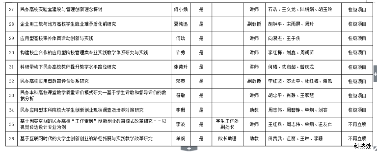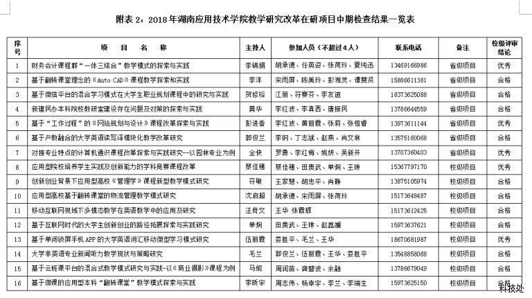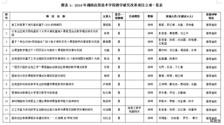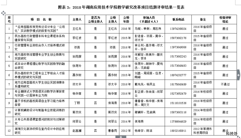 根据湖南省教育厅《关于2018年普通高等学校教学改革研究项目实施工作的通知》(湘教通[2018]164号)文件精神,学校组织了2018年湖南应用技术学院教学改革项目的申报工作。此次共有“民办高校物联网工程本科专业课程体系构建探索与实践”等36个项目申报立项,“财务会计课程群‘一体三结合’教学模式的探索与实践”等16个在研项目提交中期检查,“应用型高校视觉传达设计专业‘公司化’实训教学模式的探索与实践”等12个项目提交结题申请。