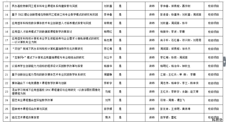 经专家评议,确定立项“民办高校物联网工程本科专业课程体系构建探索与实践”等34个项目为学校2018年度教学改革研究项目,并拟推荐“新工科背景下地方高校基于CDIO的物联网”等12个项目为省级普通教育项目。其中“基于创客空间的民办高校‘工作室制’创新创业教育模式改革研究——以视觉传达设计专业为例”“基于互联网时代的大学生创新创业的路径拓展与实践教学改革研究”两个项目已经立项为2017年湖南应用技术学院校级教学改革研究项目,此次不予重复立项。具体项目见附表1。