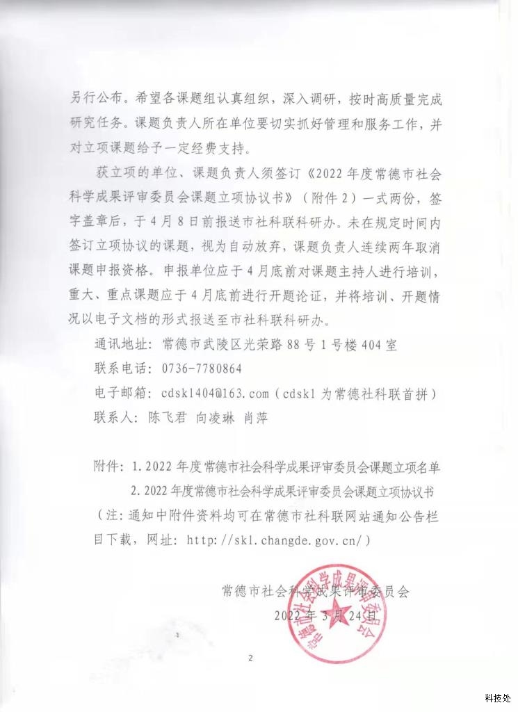 现已上传《关于公布2022年度常德市社会科学成果评审委员会课题立项的通知》,请相关课题负责人在规定时间内提交相关协议材料。